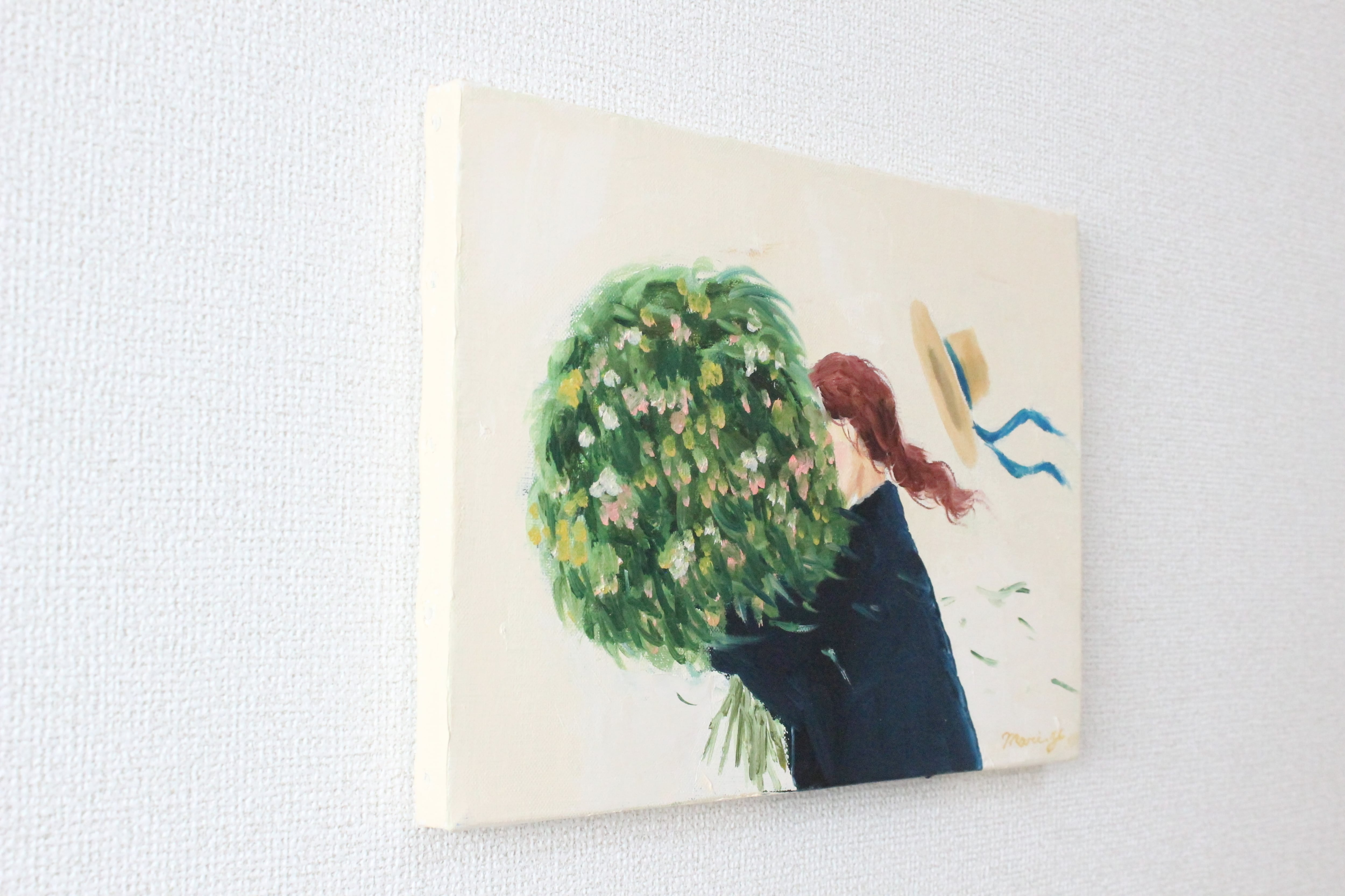 風に吹かれる少女と大きな花束を描いた油彩画です。