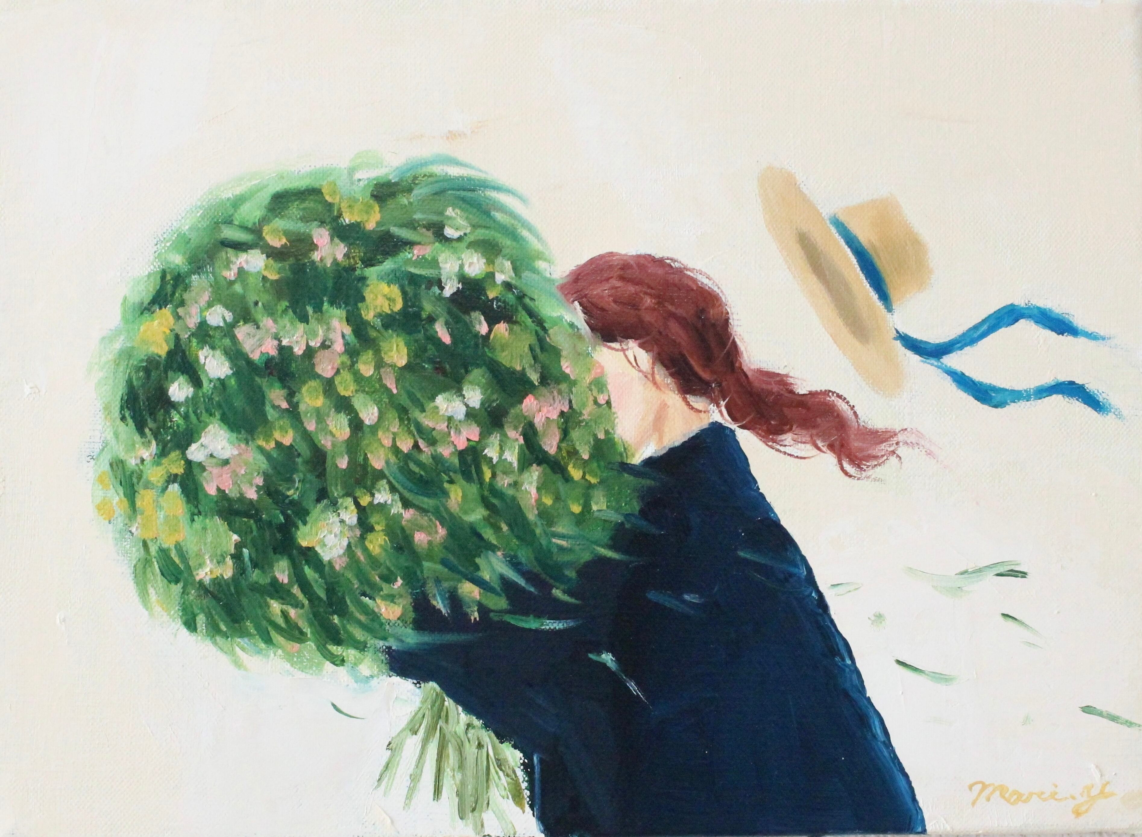 少女の顔は花束に隠れていますが、彼女の赤みがかった髪が風になびき、空中を舞う麦わら帽子がその動きを一層強調しています。