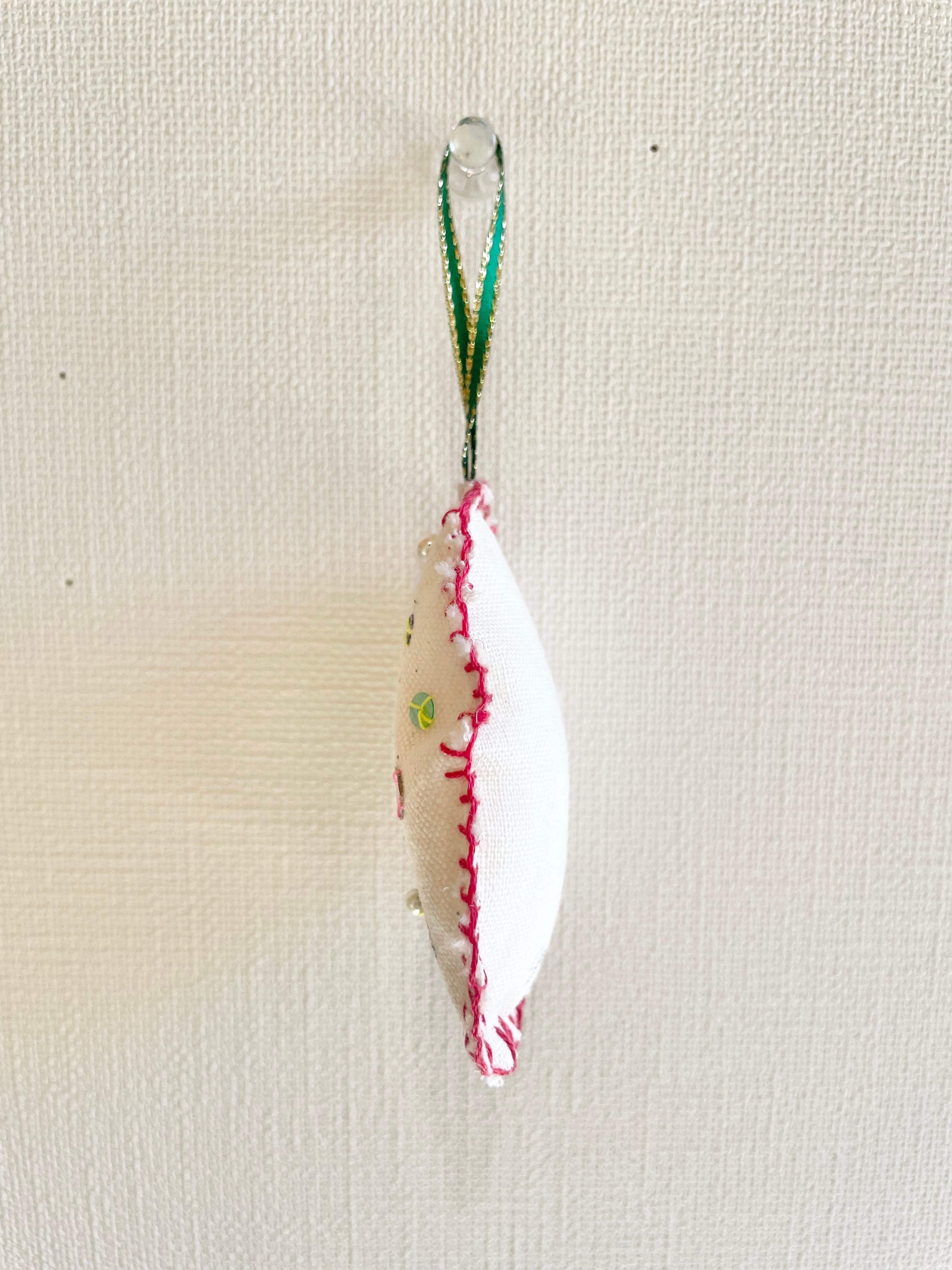 布に直接絵を描いて、ビーズ等の飾りを縫い付けた手作りのオーナメントです。クリスマスツリーに飾るのはもちろん、壁に飾ったりバックに付けても可愛いです。保管用の巾着付きです。
