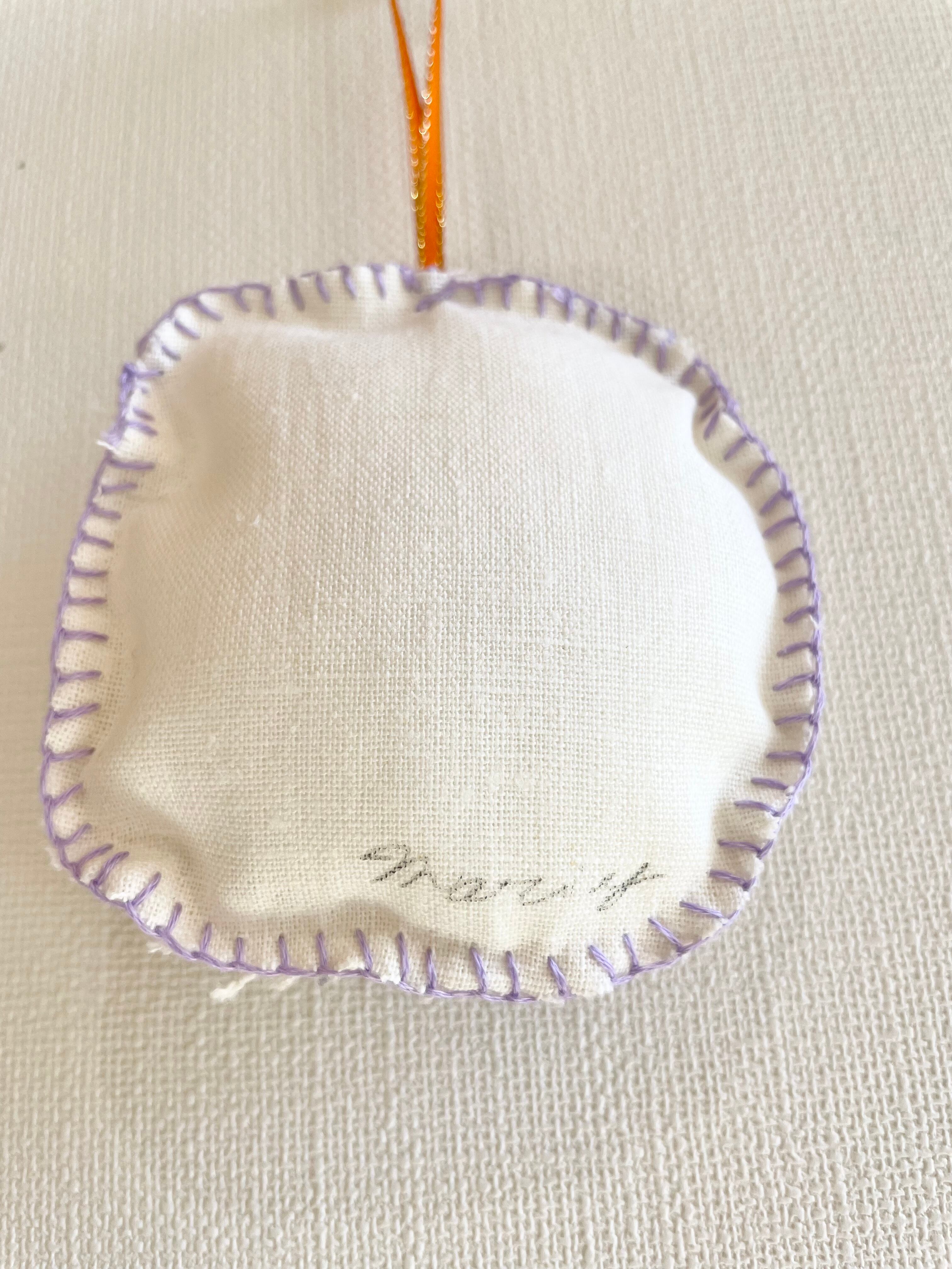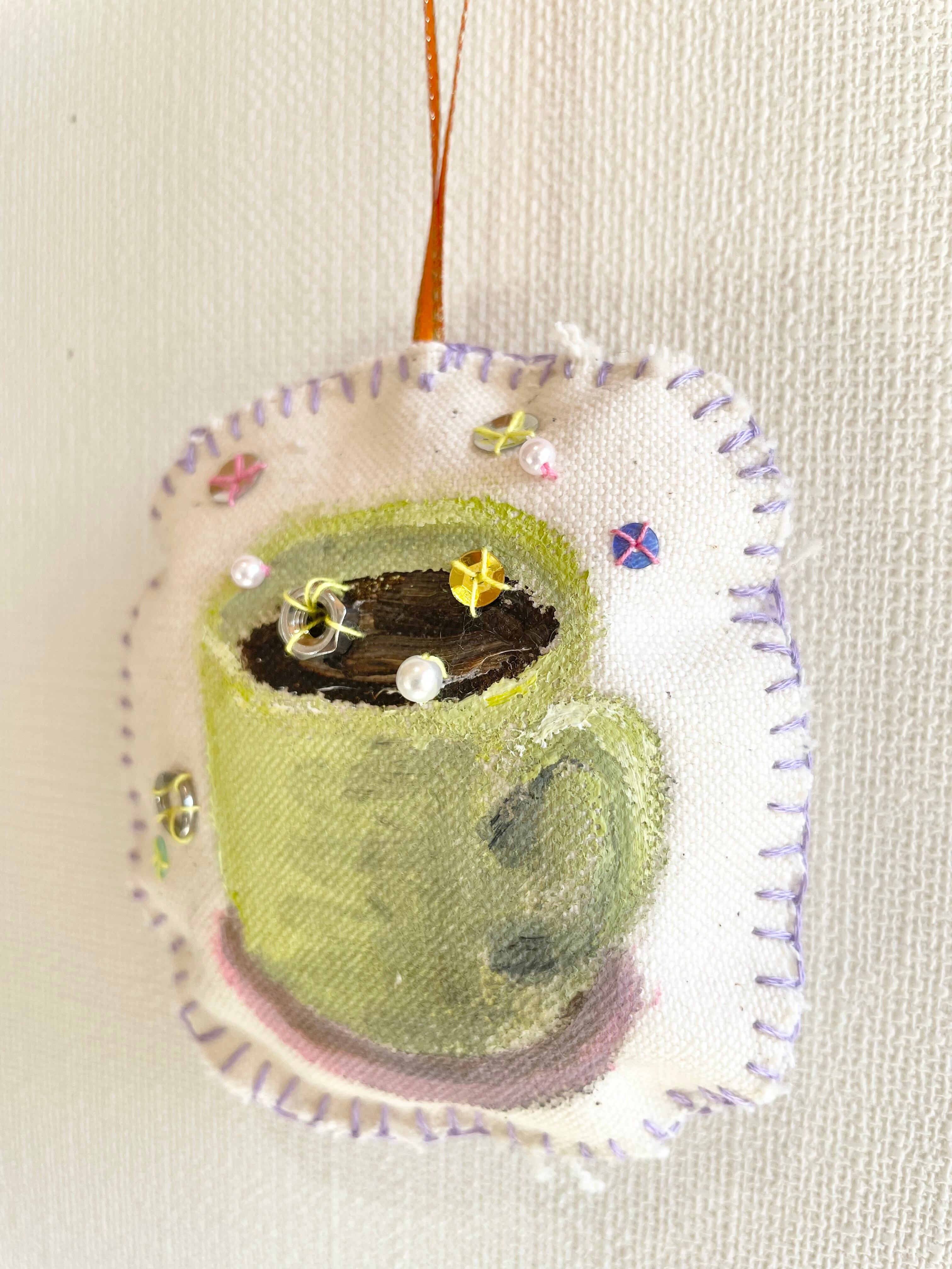 布に直接絵を描いて、ビーズ等の飾りを縫い付けた手作りのオーナメントです。クリスマスツリーに飾るのはもちろん、壁に飾ったりバックに付けても可愛いです。保管用の巾着付きです。