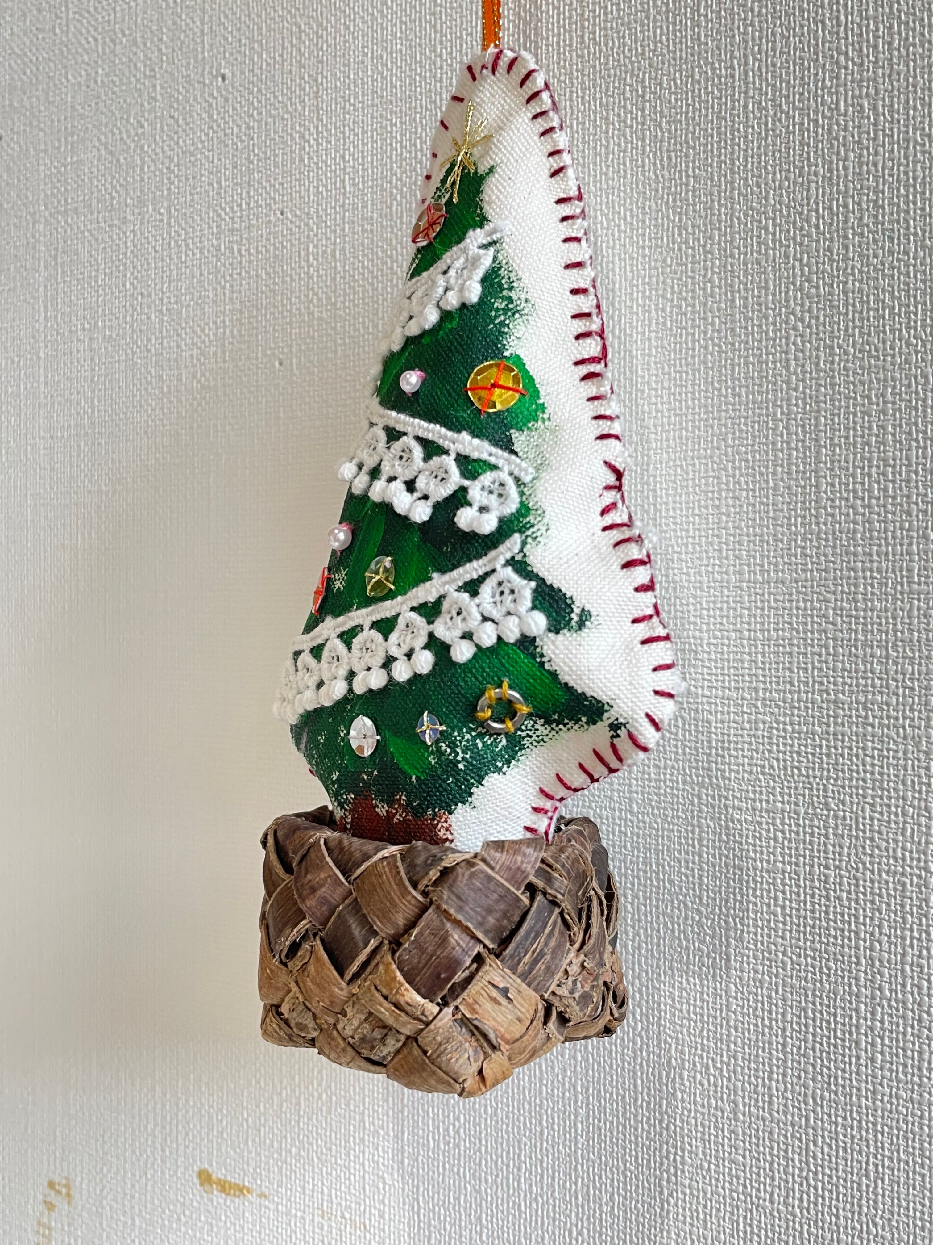 布に直接絵を描いて、ビーズ等の飾りを縫い付けた手作りのオーナメント。ミニかごはkegoya作です。