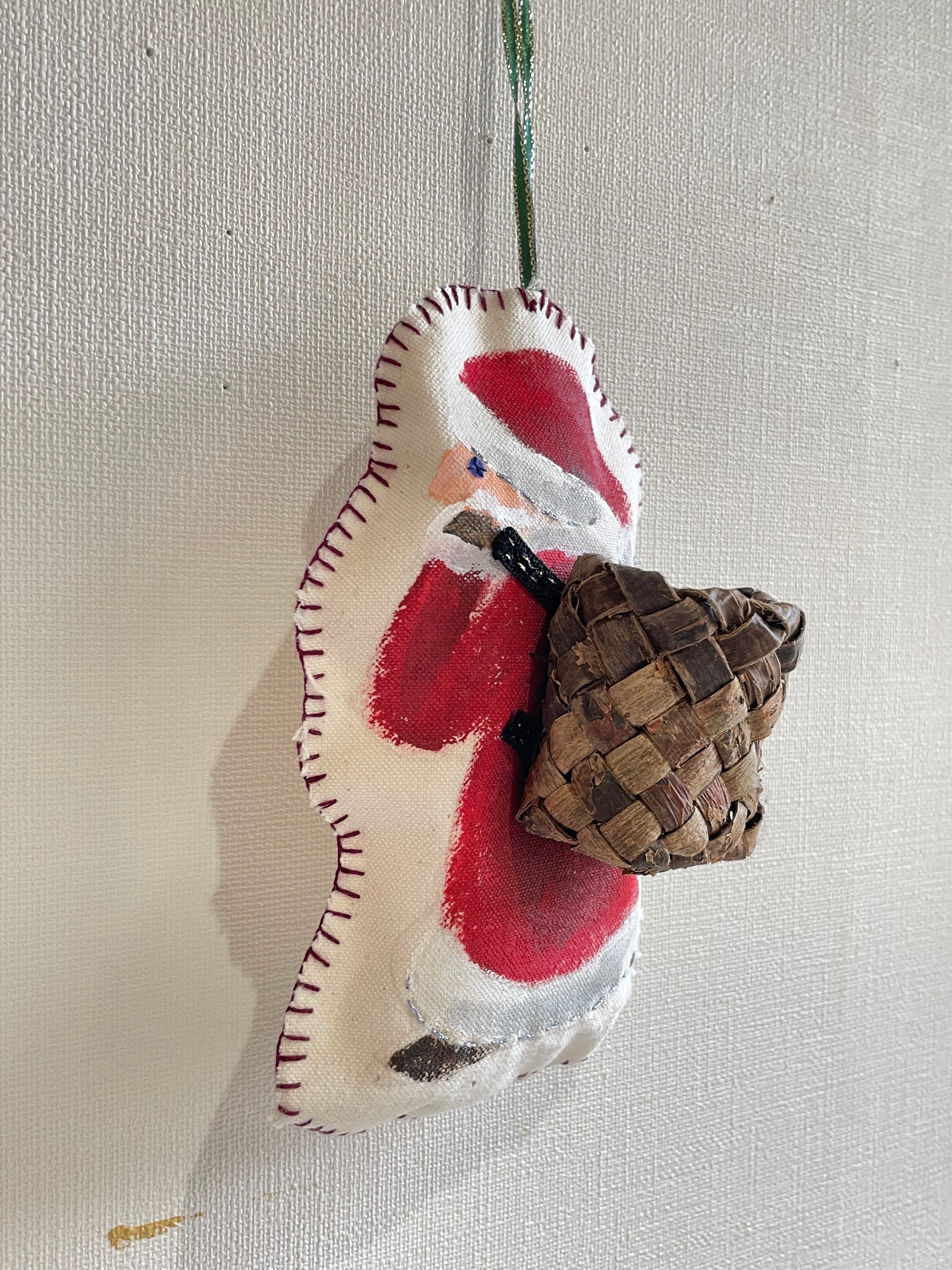 布に直接絵を描いて、ビーズ等の飾りを縫い付けた手作りのオーナメント。ミニかごはkegoya作です。