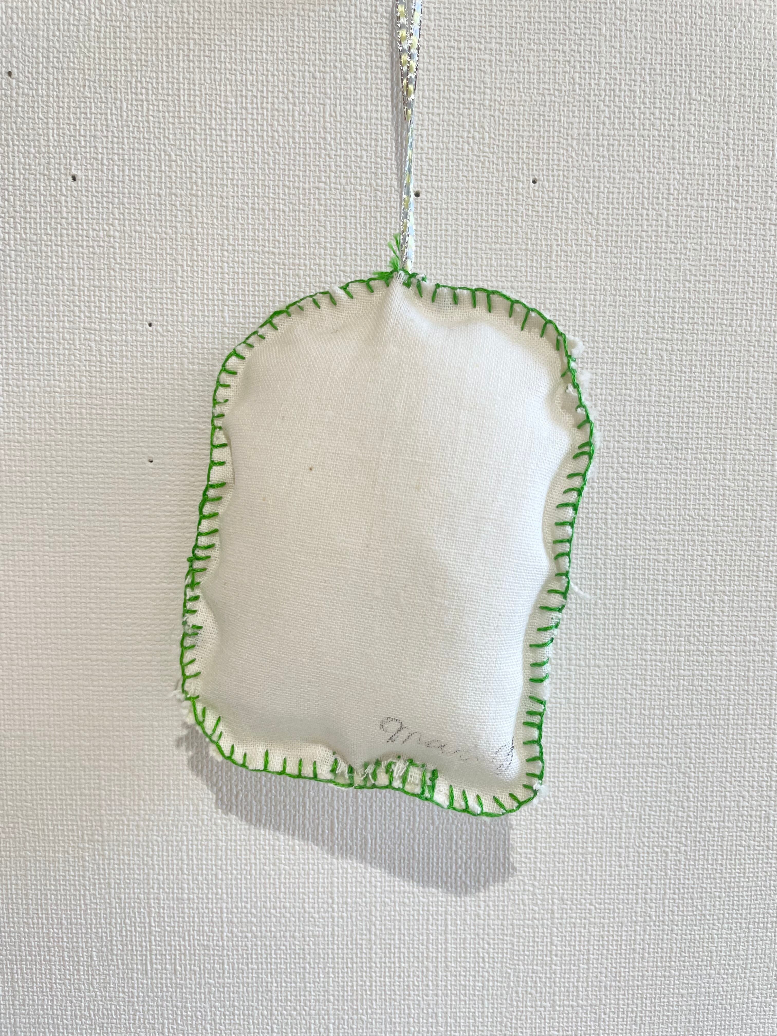 布に直接絵を描いて、ビーズ等の飾りを縫い付けた手作りのオーナメントです。クリスマスツリーに飾るのはもちろん、壁に飾ったりバックに付けても可愛いです。保管用の巾着付きです。