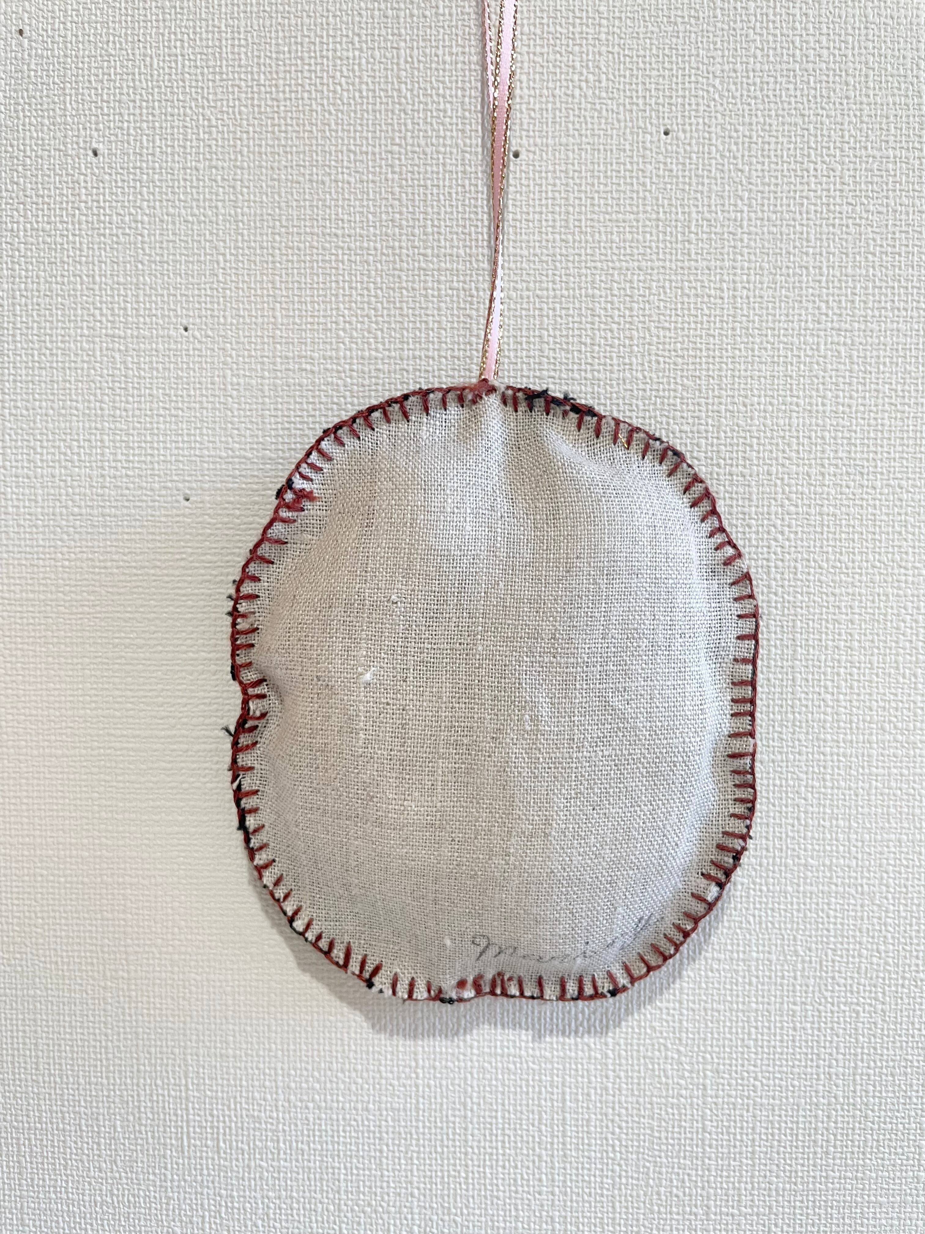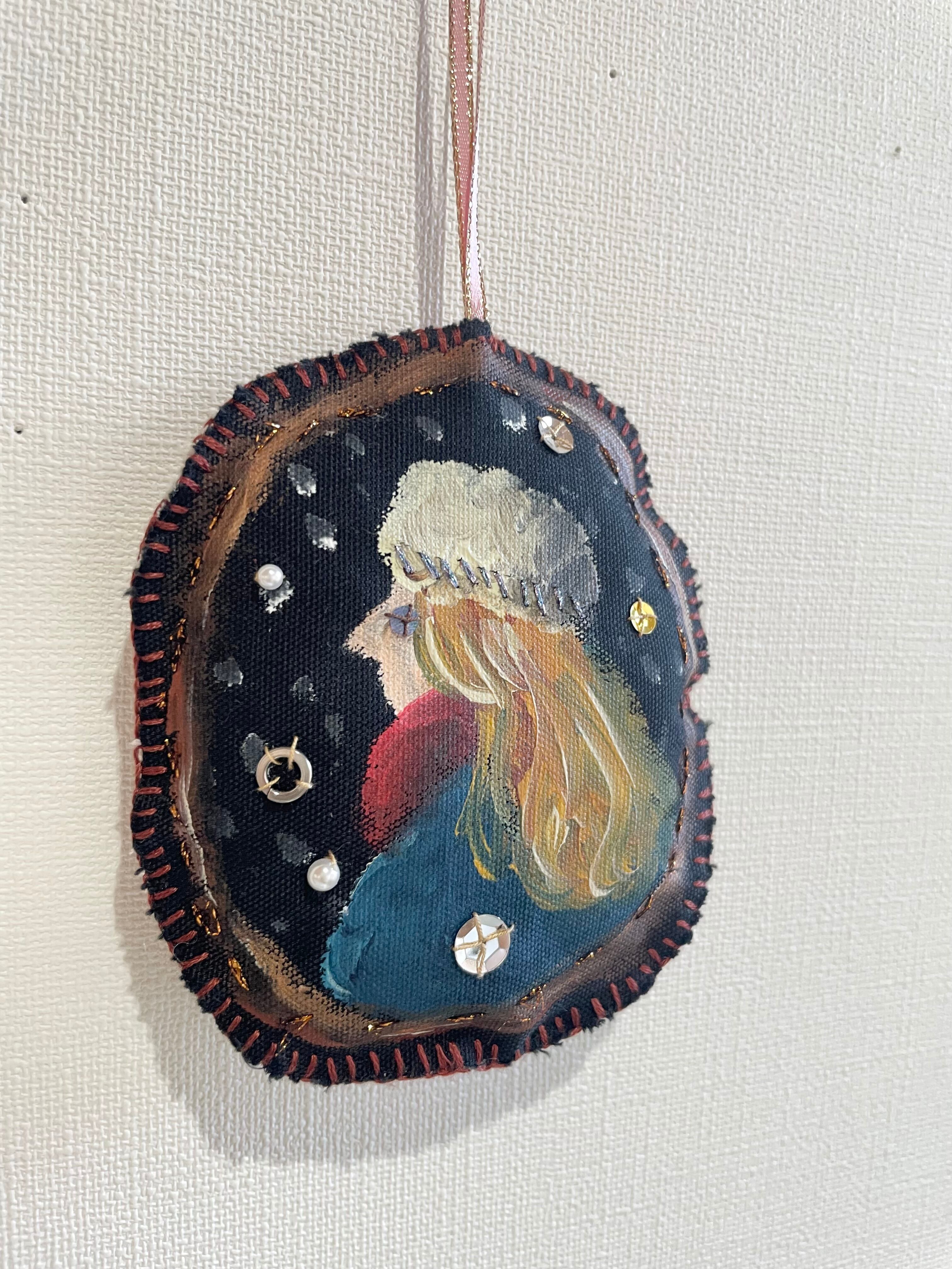 布に直接絵を描いて、ビーズ等の飾りを縫い付けた手作りのオーナメントです。クリスマスツリーに飾るのはもちろん、壁に飾ったりバックに付けても可愛いです。保管用の巾着付きです。