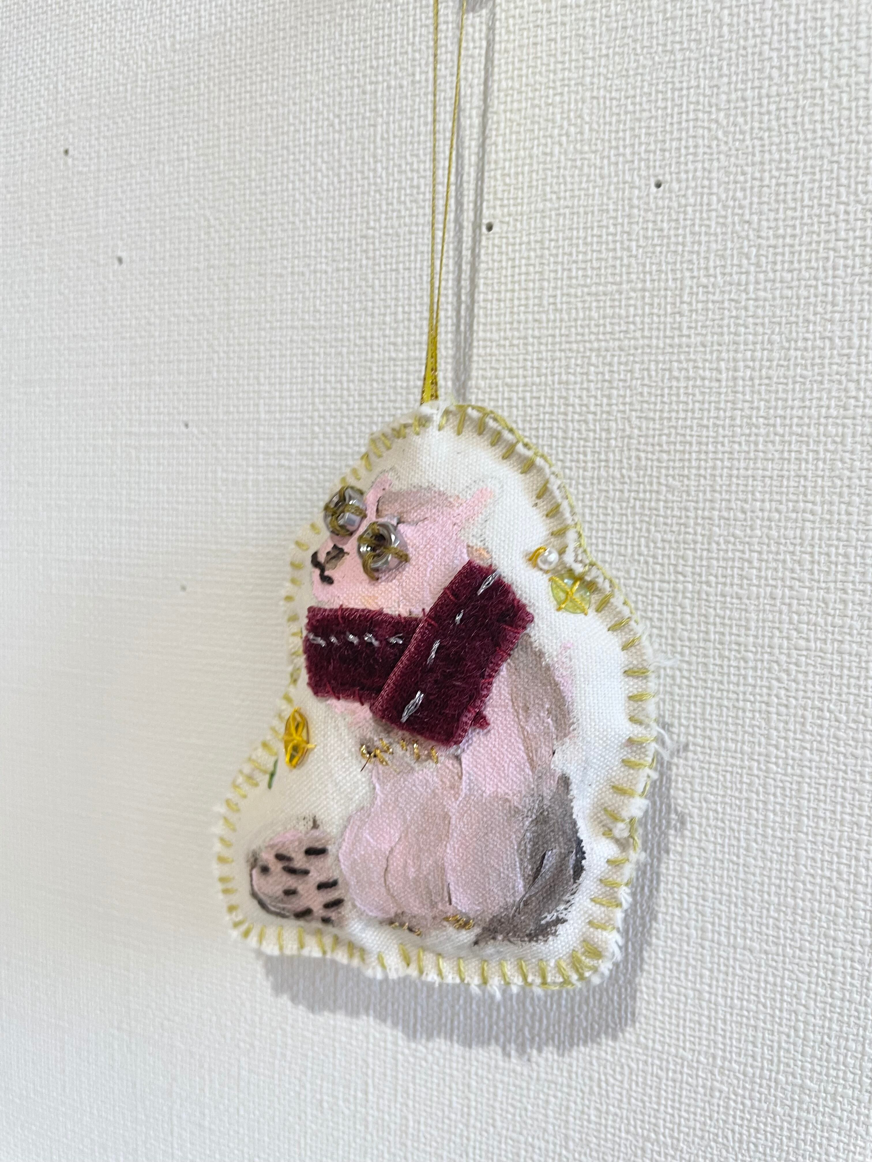 布に直接絵を描いて、ビーズ等の飾りを縫い付けた手作りのオーナメントです。クリスマスツリーに飾るのはもちろん、壁に飾ったりバックに付けても可愛いです。保管用の巾着付きです。